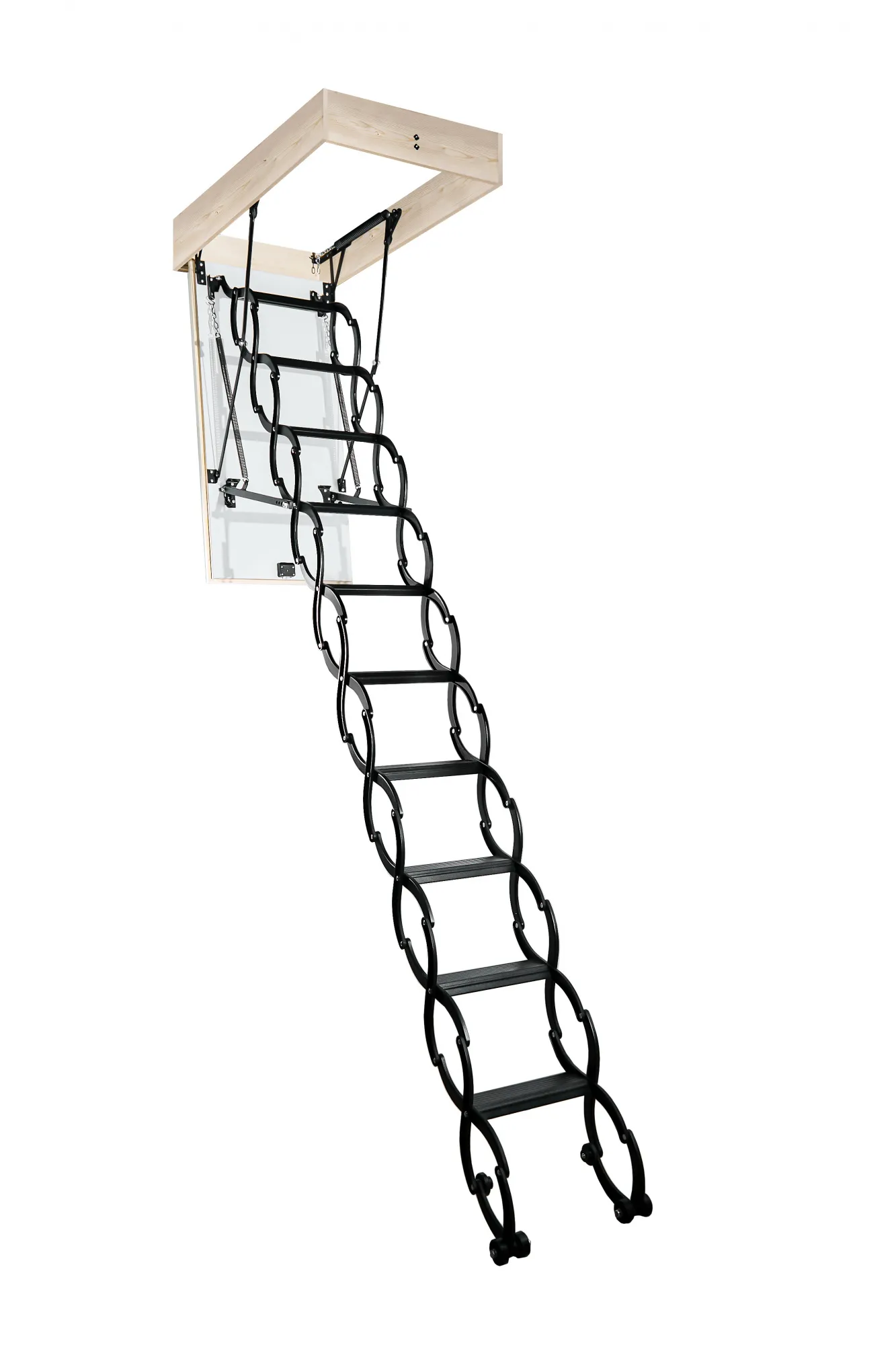 Лестница складная трехсекционная. Рабочая поверхность полностью выполнена из металла и покрашена порошковой краской. Термоизоляционная крышка типа "сэндвич", толщиной 30 мм, утеплена пенопластом, облицована с двух сторон ДCП белого цвета.