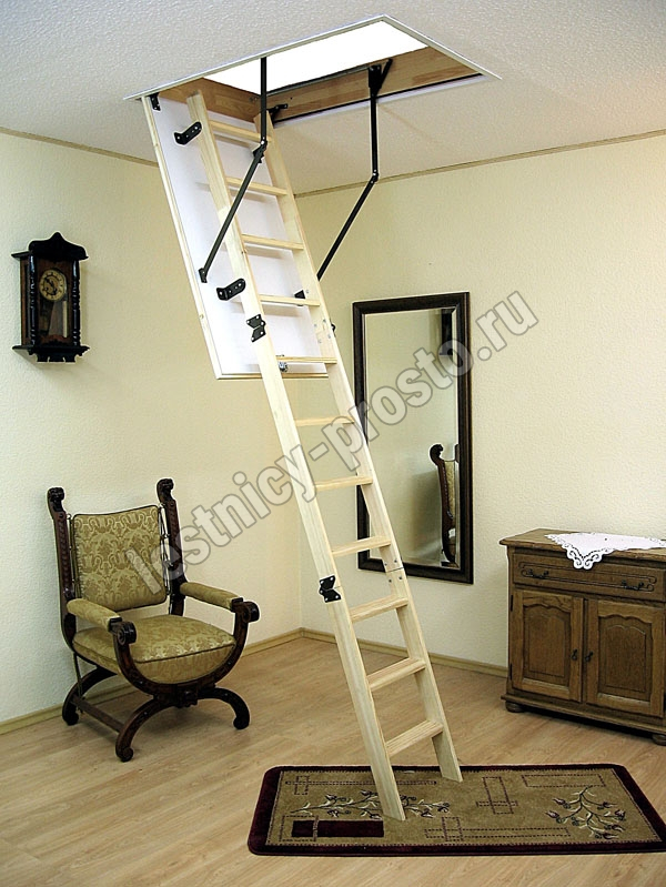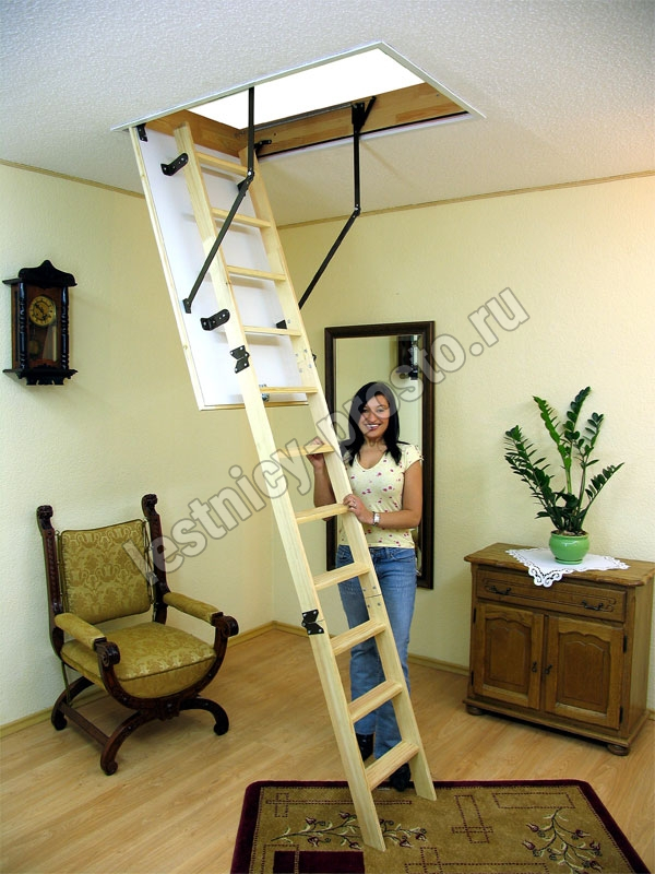 Лестница складная четырехсекционная, изготовлена из сосны. Термоизоляционная крышка типа "сэндвич" утеплена пенопластом, облицована с двух сторон ДСП белого цвета. Короб люка с уплотнителем. Все металлические элементы лестницы покрыты порошковой краской, ступени лестницы имеют антискользящие насечки и закреплены в столярное соединение «ласточкин хвост», что позволяет выдерживать нагрузку 150 кг. Деревянный стержень для открывания лестницы в комплекте.
