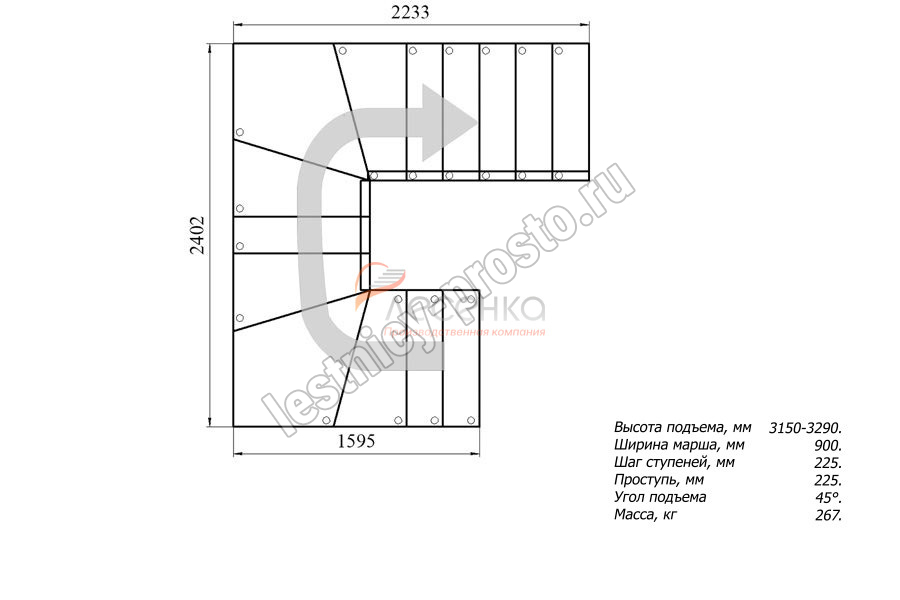 Модульная лестница Спринт 225 3150-3290, Черный, Лиственница, Нержавеющая сталь